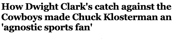 Yes, it is a book about capital-F Football, and about the place of football in society, and whether it can hold that place in society given its inherent contradictions and given its fundamental brutality. (And in that sense, it is quite insightful.) It is also a book about football’s sense of regimentation and control versus the spontaneity and freedom that still manages to emerge out of that system. And here is what I’d argue: This is the most personal book you’ve written since your first one, a memoir about heavy metal called Fargo Rock City. Particularly in the chapter that covers Texas football, from Friday Night Lights to North Dallas Forty to the six-man game. While you don’t explore your deep love of the Cotton Bowl—and while you still often write with vintage Klostermanian detachment--you do explore your fealty toward Roger Staubach in a way I though you never would. This is you wrestling with a surprisingly deep level of emotion you are not quite sure what to do with, and are openly embarrassed to admit to. This chapter in particular is a Proustian love letter to football, to Texas, to Staubach, and oddly, to the city of Dallas, a place that you otherwise have zero emotional connection with.
