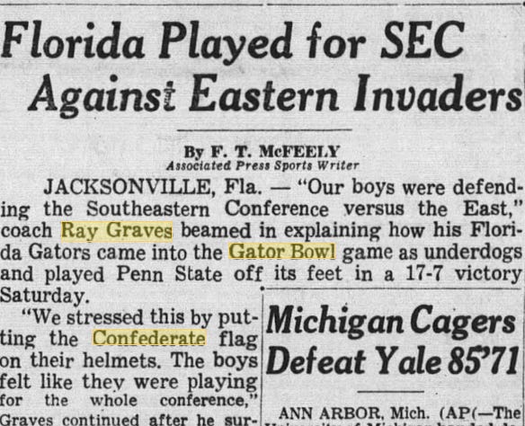 Those flags were added to Florida’s helmets especially for this game, replacing the Gators’ traditional block numbers. They were a way of hyping up an otherwise meaningless bowl game, one in which Penn State was heavily favored but had little motivation to win, and one in which Florida, under coach Ray Graves, had decided to motivate his 6-4 team by playing up the regional (North versus South) aspect of this game—which of course was an unsubtle way of playing up the racial aspect of this game, since Penn State’s program was desegregated and Florida’s was not. Graves framed the criticism of his team as akin to criticism of the south itself. Before kickoff, the Florida marching band took the field playing Dixie and waving a massive confederate flag.