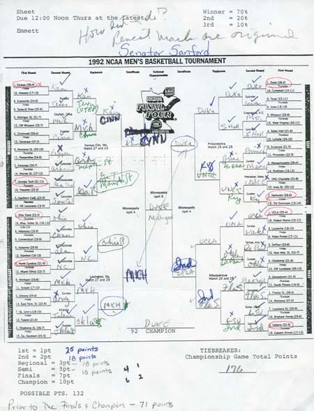 The postal worker in Louisville was a man named Bob Stinson, who apparently came up with the idea by looking at the bracket of his recreational-league softball tournament. He drew his brackets using a ruler and unlined paper, and perhaps most important, he charged a nominal entry fee. The idea of the NCAA tournament pool was not about making any real money; the idea of the NCAA tournament pool was to heighten the excitement and sheer unpredictability of the NCAA tournament itself. “It was kind of a betting thing but not really,” Stinson’s son Damon told the Associated Press. “It was kind of a who-knows-college-basketball-better kind of thing.”