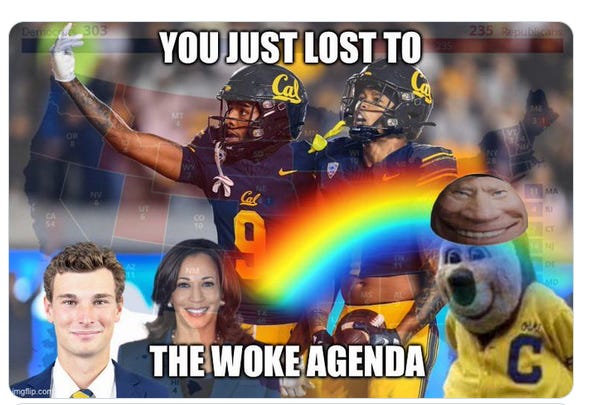 The larger context here is obvious: There is a sense among a more culturally conservative swath of America that college football has long belonged to them. (As if to hammer home that point, a Republican presidential candidate from New York City attempted to gain a competitive advantage in a swing state by showing his face at the Alabama-Georgia football game, even though he has likely never watched an entire college football game in his nearly 80 years on this planet.) But Cal, by sheer force of meme, is throwing down the gauntlet on those long-accepted social mores—just as the Democratic party chose as their vice presidential candidate a former football coach who speaks in football metaphors.