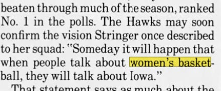 The late 1980s were still an aspirational moment for women’s basketball. But it was also a moment when you could begin to see the path forward. Take this quote from Iowa coach C. Vivian Stringer, which would become eerily prescient some 35 years later: