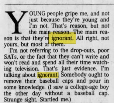 Here is a real-life opening of a newspaper column written by a grumpy older man in 1994: