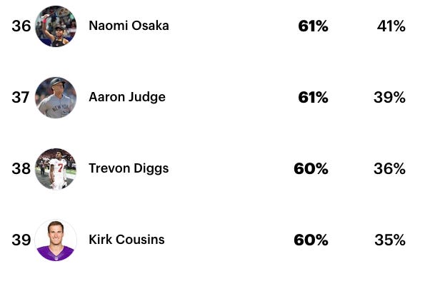 In 2020, the Dallas Cowboys drafted Trevon Diggs in the second round of the NFL draft. Diggs, a cornerback, made the Pro Bowl in 2021 and 2022; he has, over the course of the past five years, been one of the better defensive players on one of the most popular football teams in America, but he is certainly not a household name. In 2024, Diggs played 11 games and then sat out the rest of the season due to knee surgery, and I promise there is a reason I am reciting information from Diggs’ Wikipedia page, as it relates to this YouGov poll of the most popular contemporary athletes in American in the fourth quarter of 2024.